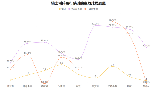 斯特鲁斯上赛季场均9.4分,两项命中率分别为44.2%与38.6%,实际上从得分产量与效率上来看他并不算骑士队内最高效的射手,除了核心球员外,无论是亨特、勒韦尔还是杰罗姆的产量效率均胜于他,但从适配骑士进攻体系与特定时刻时他并不输其余队友: